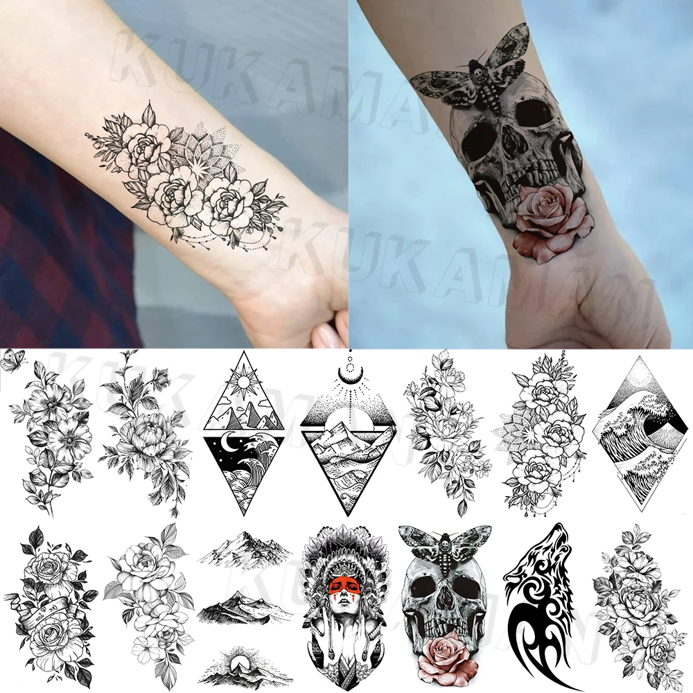 3d Black Flower Skull Temporary Tattoos For Women Kids Men Geometric Mountain Wolf Fake Tattoo Realistic Body Art Painting Tatoo Temporary Tattoos Aliexpress