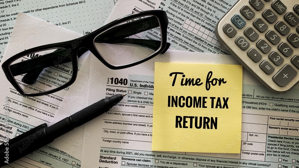 Time For Income Tax Return Text On Sticky Note With Tax Form Calculator Pen And Glasses Background Stock Photo Adobe Stock